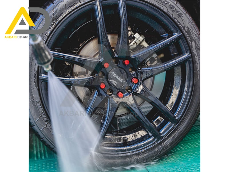 محصول را بر روی رینگ و لاستیک اسپری کرده، صبر نمایید تا محصول تغییر رنگ داده و سپس آن را با آب پر فشار تمیز نمایید. در صورت نیاز می‌توانید از فرچه رینگ استفاده نمایید.