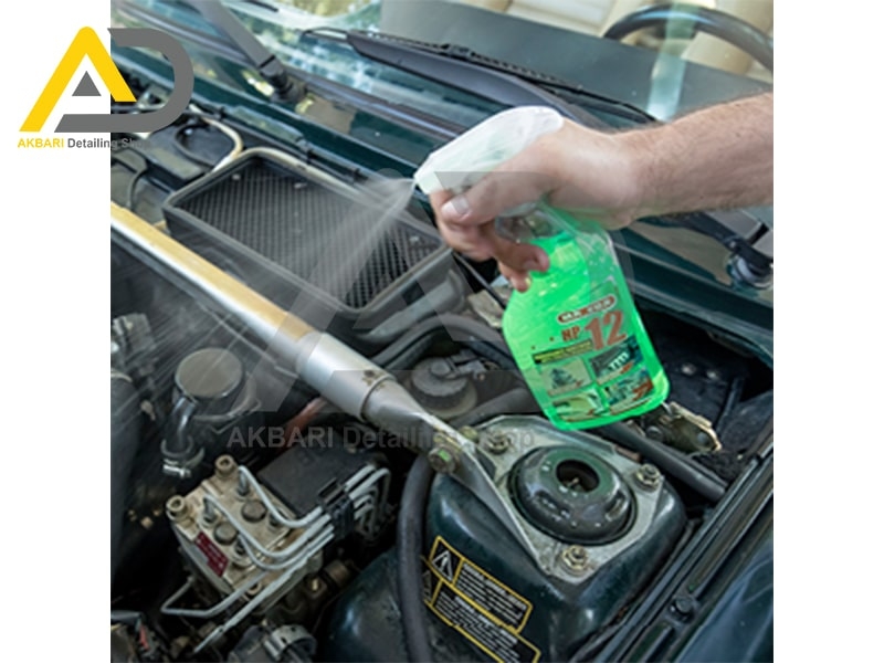 براي شستشوي حرفهاي موتور: ابتدا از سرد بودن سطح موتور مطمئن شوید و سپس مواد مایع تمیزکننده را توسط تورنادوگان موتور يا ظروف پاشش مایعات روي سطح موتور ماشین اسپری نموده و پس از گذشته 3 دقيقه نسبت تميز كردن موتور با قلم ديتيلينگ يا فرچههاي مخصوص موتورشويي اقدام كنيد. توجه داشته باشید که استفاده از فرچههاي مخصوص و حتي معمولي در هنگام شستشوی موتور خودرو باعث ايجاد نيروي فيزيكي بيشتر میشود. در نتیجه تاثير مواد شوینده افزایش یافته و ضريب مصرف آن را پايين ميآورد. سرد بودن سطح موتور براي هر گونه شستشوي موتور اهميت بسياري دارد؛ زيرا حرارت موتور بسيار بالا بوده و پاشش هر گونه مواد شوينده روي موتور داغ، باعث تبخير سريع آن و در نتيجه از بين رفتن تاثير شوينده خواهد شد. پس از تميز كردن تمامي نقاط با مایع تمیزکننده چندمنظوره و مطمئن شدن از تاثير مواد شوینده و تميز شدن تمام نقاط، سطح موتور را با فشار كم آب شستشو داده و دقت كنيد آب به داخل اتصالات الكترونيكي و سر شمعها نفوذ نكند. براي جلوگيري از نفوذ آب به داخل اتصالات و شمع ماشين توصيه ميشود از اسپريهاي گريس و عايق مخصوص اين قطعات استفاده کنید. در مرحله آخر، تمام سطح موتور را با دستمال مايكروفايبر خشك نموده و در صورتی که مواد شوینده روي موتور باقی مانده است، آن را كاملا پاك کنید.